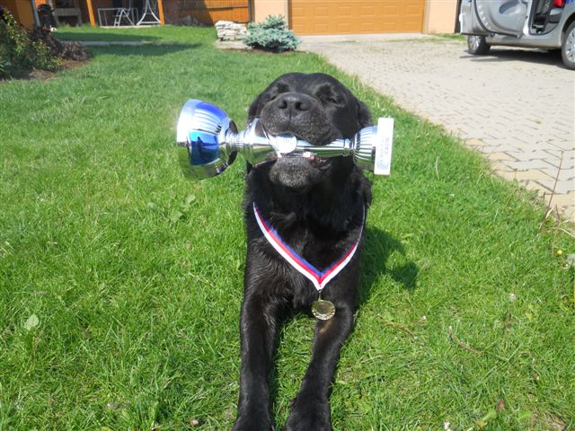 4apůl letý černý pes, čistý vyvážený vzhled, milá samčí hlava, správný krk navazuje na dobře utvářená ramena, hruď správné hloubky, šířky i délky, vynikající hřbetní linie a nasazení ocasu, velmi dobře osvalený, pohyb vyvážený, dobré nohy a tlapky, srst správné tvrdosti.